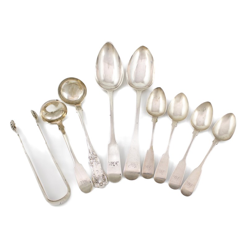 comprising: a George IV tablespoon by Henry Mouncie, Dumfries circa 1827, with engraved initials to the terminal, a mid-19th century tablespoon by George Elder, Banff circa 1840, with engraved initials to the terminal, a pair of sugar tongs by J. Pearson, Dumfries, a set of four Victorian Fiddle teaspoons, by David McDonald, Glasgow 1841, with engraved initials to the terminals, plus two ladles, total approx. weight 11.9oz. (9)