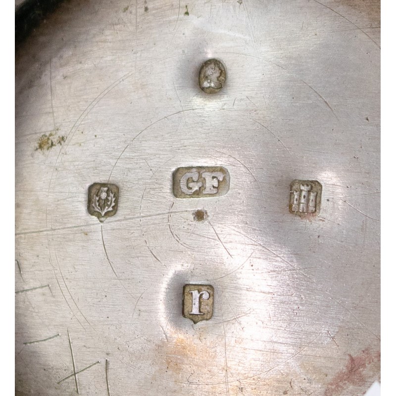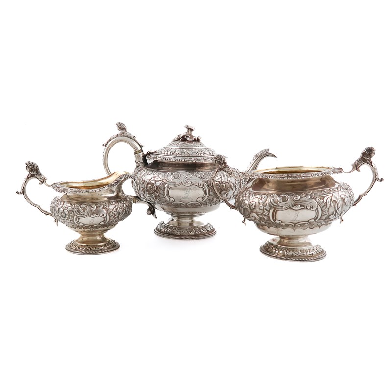 circular form, chased foliate scroll decoration on a matted background, the scroll handles with female masks, the hinged cover with a flower final, on raised circular bases with rope-work borders, length handle to handle 27.5cm, approx. weight 60oz. (3)