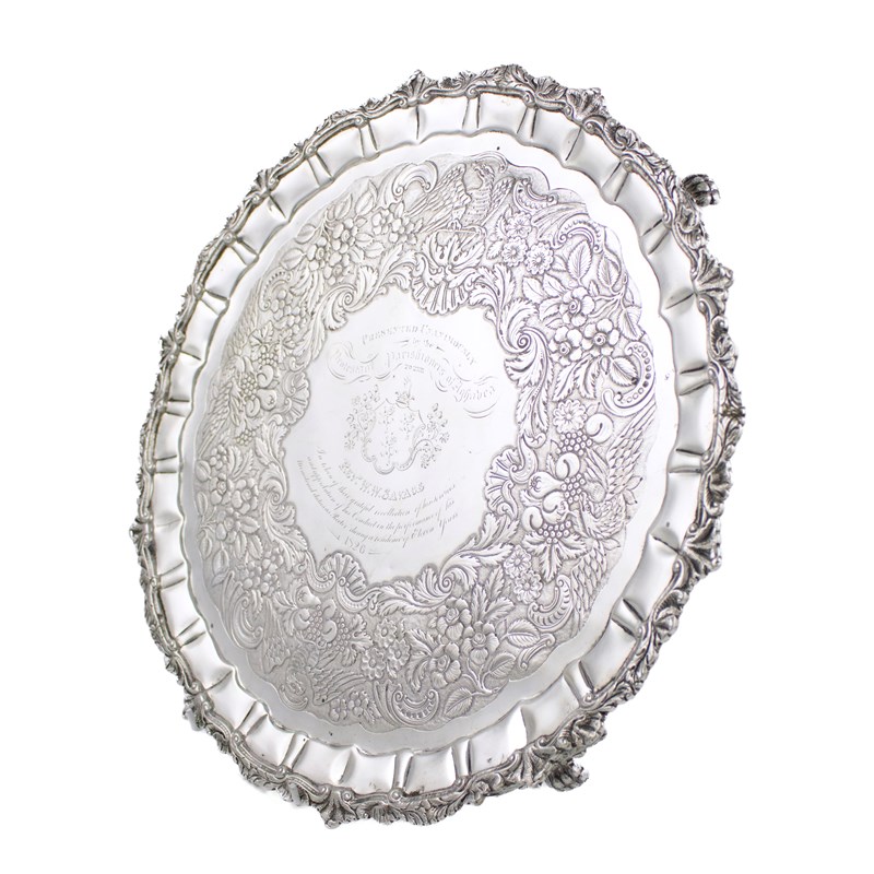 circular form, scroll foliate and shell moulded border, embossed foliate decoration, engraved with armorial and a presentation inscription to the Rev W.W. Savage from his parishioners 1826, on four foliate and paw bracket feet, diameter 36.7cm, approx. weight 39.2oz.