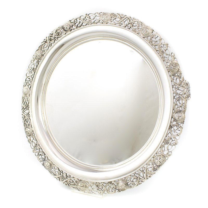 circular form, pierced Celtic border on three Celtic bracket feet, diameter 34.2cm, approx. weight 35oz.