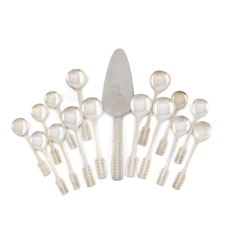 textured decoration, comprising: a set of six teaspoons, a set of eight coffee spoons, and a serving slice, approx. weighable 12.1oz. (15)