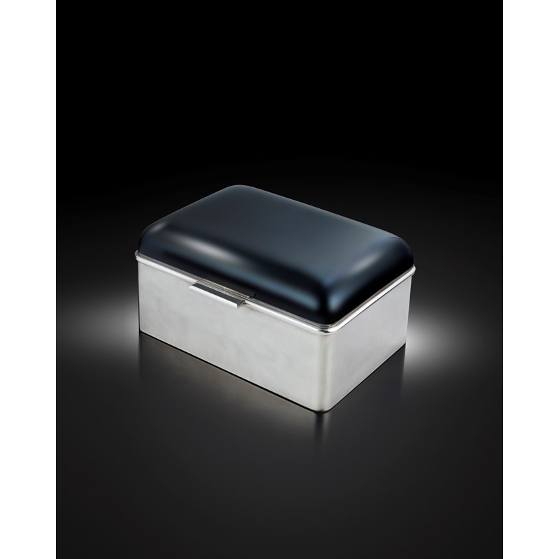 rectangular form, plain thumb-piece, raised enamelled black cover, the underside with radiating textured decoration, the hinged cover opens to reveal a wood-lined interior, the inside of the cover with a screw-out textured filter, the edge inscribed 'Leave for Five Minutes in Water', with four detachable screw-in legs lacking bun feet, length 24.2cm x 17.5cm x 12cm.