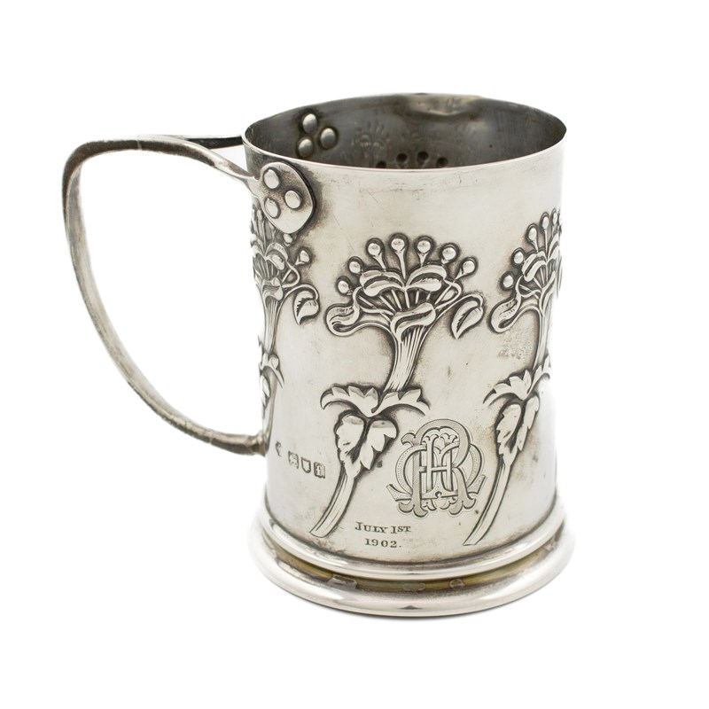 cylindrical form, bifurcated scroll handle embossed flower decoration, initialled, height 9cm, approx. weight 4oz.