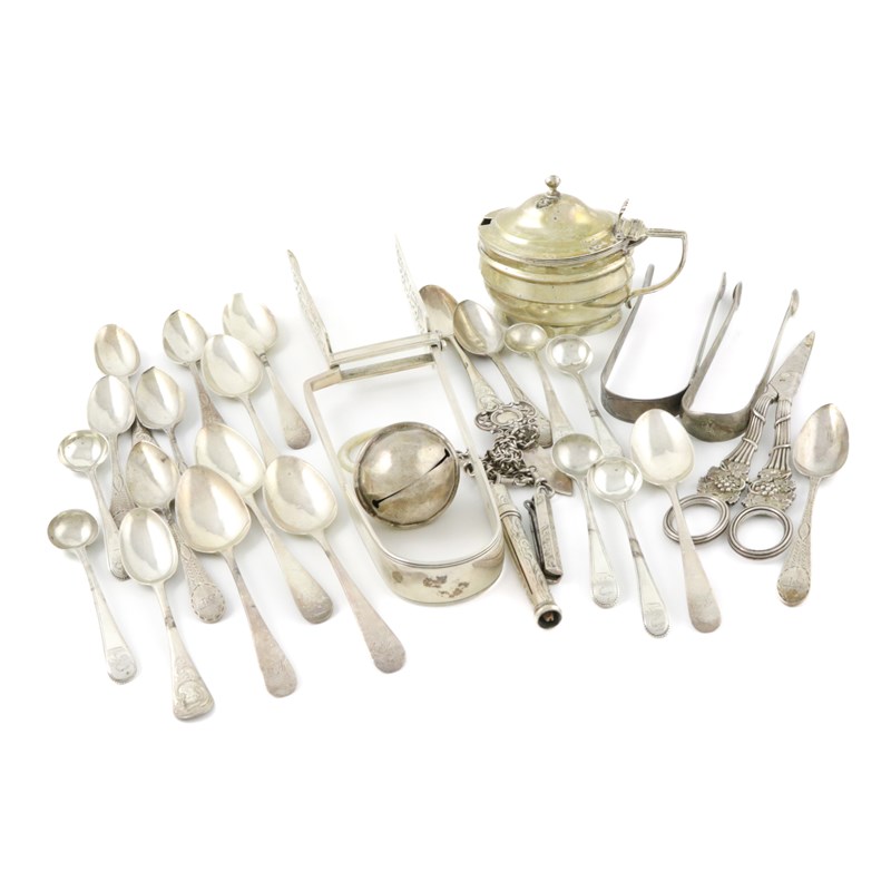 comprising: a William IV silver asparagus tongs, six salt spoons, fourteen teaspoons, two sugar tongs, a mustard pot, grape scissors, a bell and a belt hook and attachments, total approx. weight 27.7oz. (qty)