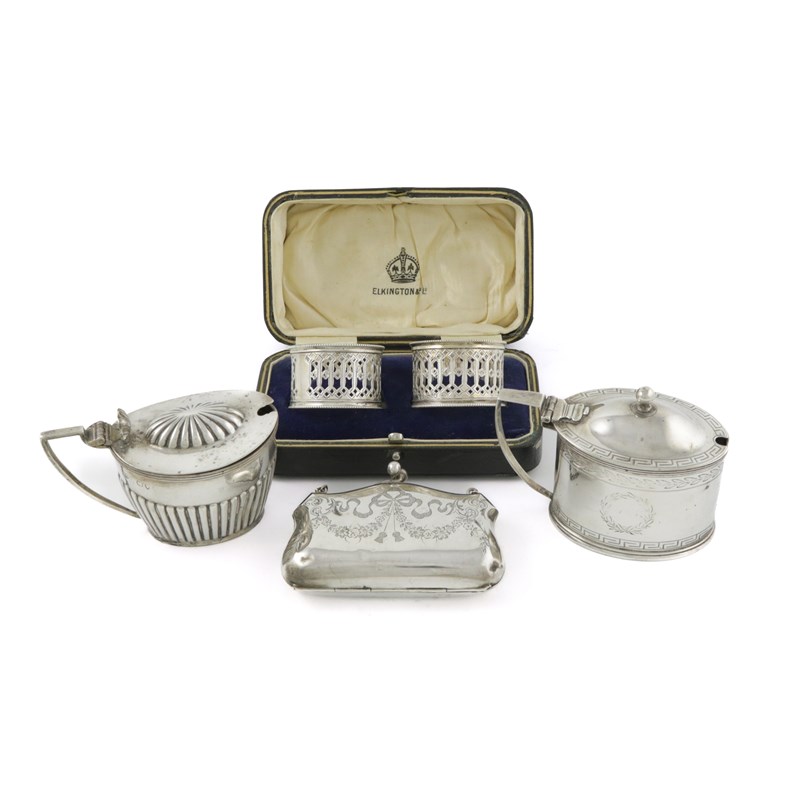 comprising: a Scottish George III mustard pot, possibly by William Auld, Edinburgh 1806, oval form with engraved decoration, plus a mustard pot, a purse and a cased pair of napkin rings, total approx. weight 9.7oz. (5)