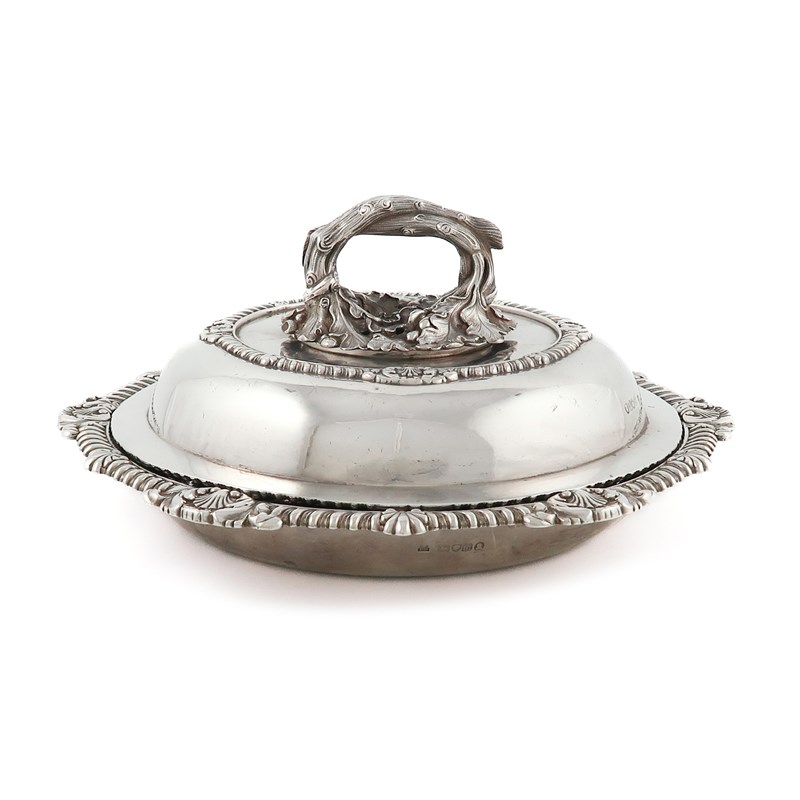 circular form, shell scroll foliate and gadrooned borders, with an acorn and oak leaf formed handle, diameter 28.2cm, approx. weight 60.4oz.