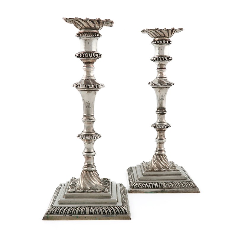 tapering baluster columns, scroll shoulders, spool-shaped capitals with gadroon borders, detachable drip pans, engraved crests, on stepped square bases with gadroon border, height 26.4cm, total approx. weight 44.3oz. (2)