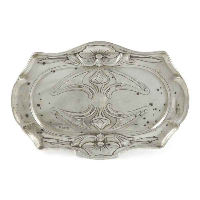 oblong shaped form, with embossed floral decoration, length 31.3cm, approx. weight 13.2oz.