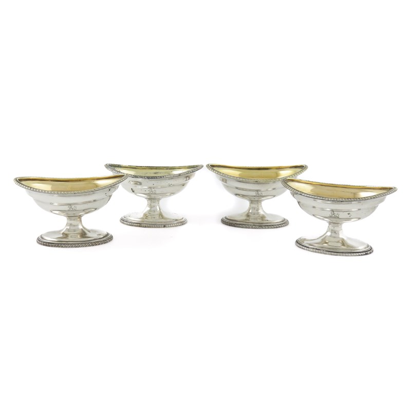 oval form, gadrooned border, on raised oval bases, engraved with crests, length 10.4cm, total approx. weight 13.6oz. (4)
