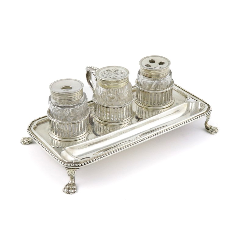 rectangular form, beaded border, pen well with engraved crest, with three silver-mounted glass bottles for ink and sand, on four paw feet, length 21.1cm, total approx. weighable 13.3oz.