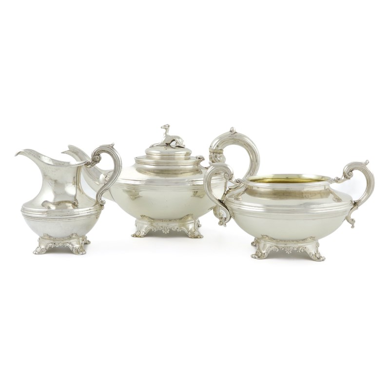 circular form, scroll handles with ivory insulators to the teapot, bands of reeded decoration and borders, with a greyhound finial, on foliate and shell bracket feet, length handle to handle 27.5cm, total approx. weight 39.9oz. (3)