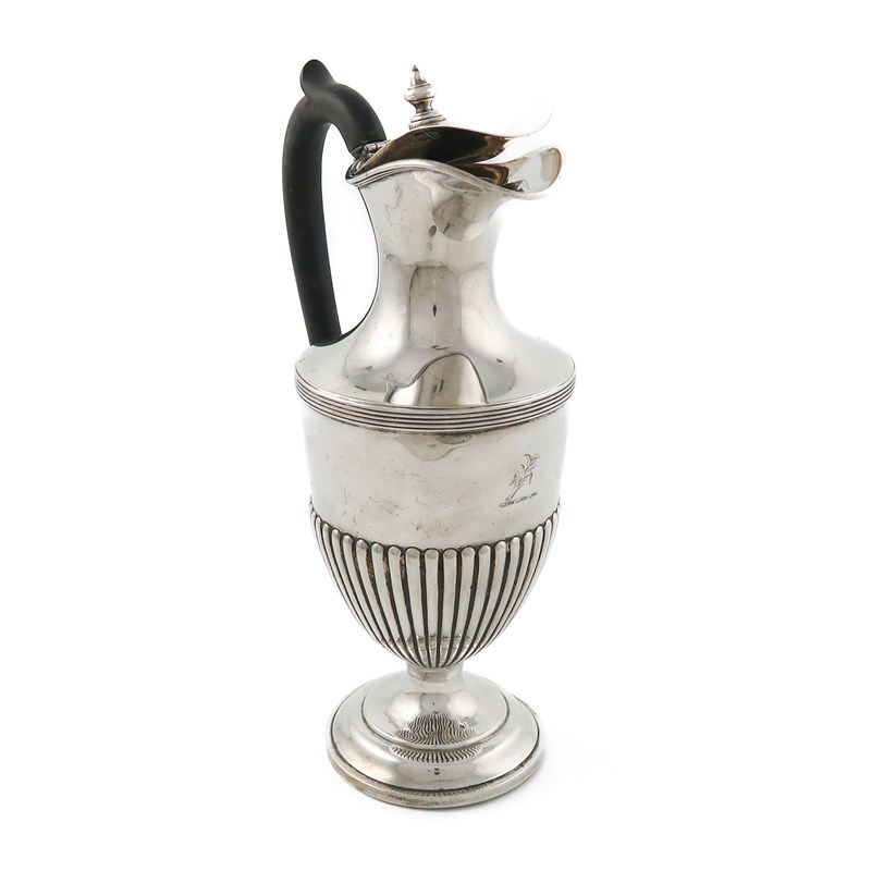 vase form, scroll handle, reeded and part fluted decoration, with an engraved crest, a domed hinged cover with knop finial, on a raised circular foot, height 23.3cm, approx. weight 14.1oz.