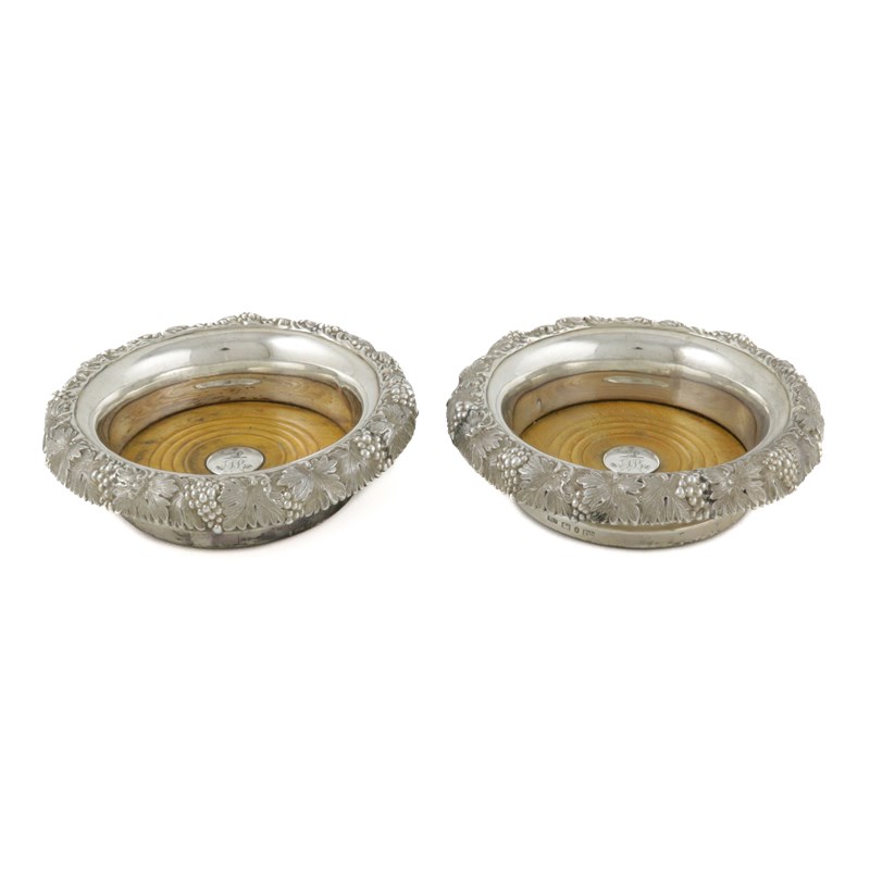 circular form, with a grapevine and grape decorated border, with engraved crest to the central cartouche, diameter 17.3cm. (2)