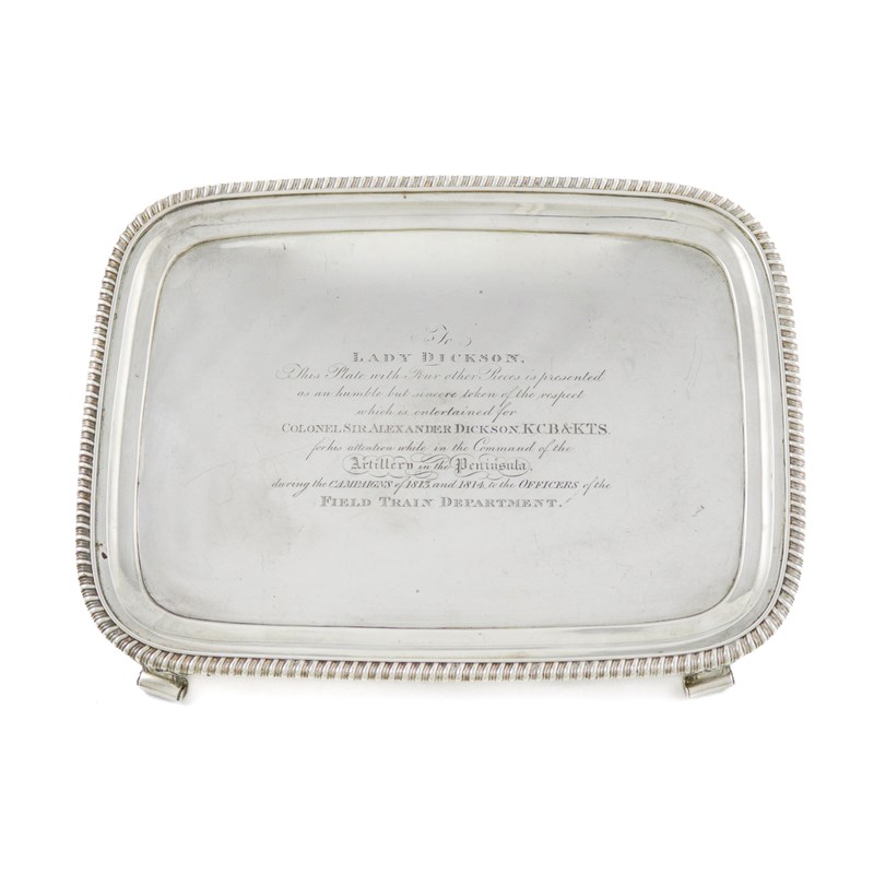 rectangular form, gadrooned border, inscribed 'To LADY DICKSON, This Plate with Four other Pieces is presented as an humble but sincere token of the respect which is entertained for COLONEL SIR ALEXANDER DICKSON. K.C.B & K.T.S. for his attention while in Command of the Artillery in the Peninsula, during the CAMPAIGNS of 1813. and 1814. to the OFFICERS of the FIELD TRAIN DEPARTMENT', on four foliate scroll bracket feet, length 33.7cm, approx. weight 40oz.