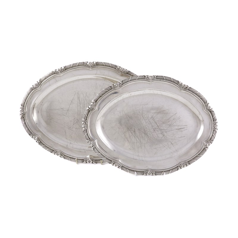 moulded oval form, with reeded and foliate border, one stamped with retailers mark Rundell Bridge & Rundell, length 43.5cm, total approx. weight 95.4oz. (2)