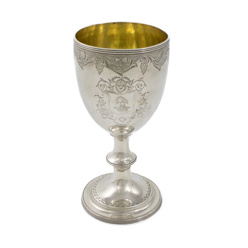 circular bowl, engraved vine decoration, and engraved with a crest, on a raised knopped circular foot, height 16cm, approx. weight 5.5oz.