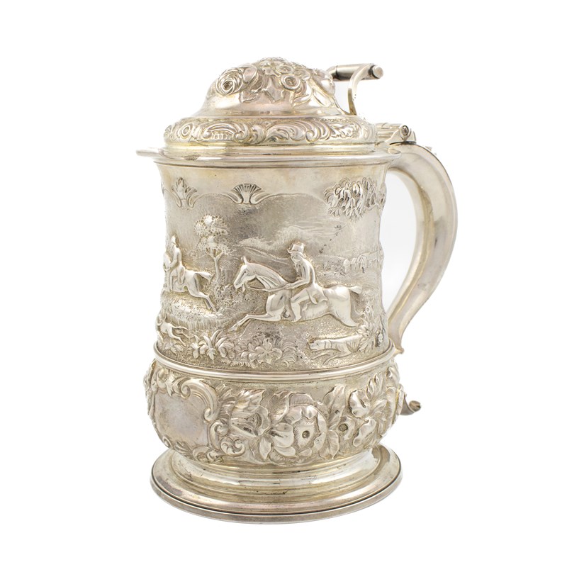 tapering circular form, later decoration of a fox hunting scene and chased scroll foliate decoration, domed hinged cover with a pierced thumbpiece, scroll handle, on a raised circular foot, height 18.6cm, approx. weight 25.8oz.