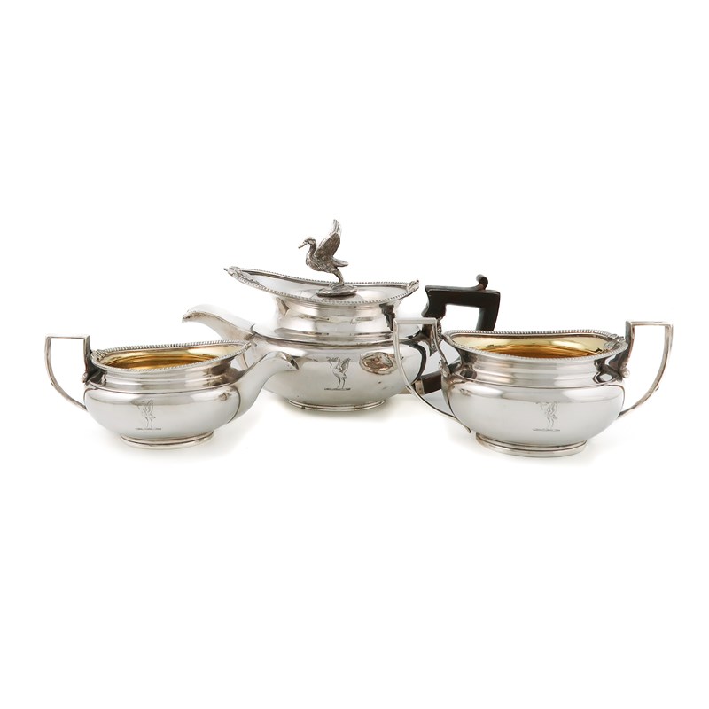 circular bulbous form, gadroon, scroll and shell border, cape collar with a flush hinged cover with a later unmarked crane finial, engraved with crests, length handle to spout 25.4cm, total approx. weight 39.5oz. (3)