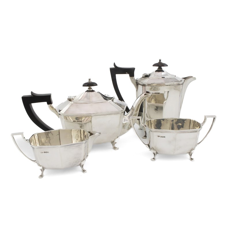 faceted rectangular form, domed hinged cover, scroll handles and knop finials, on four pad feet, length of teapot handle to spout 27.6cm, total approx. weight 47.9oz. (4)