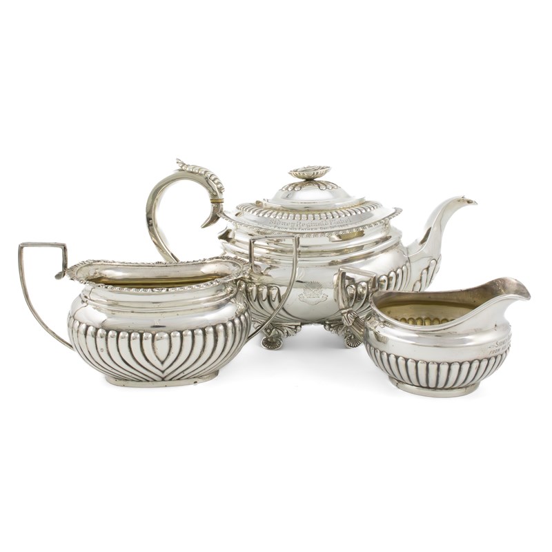 comprising: a George III teapot, by Alice & George Burrows, London 1818, a George III cream jug by William Burwash & Richard Sibley, London 1809 and an Edwardian sugar basket by George Nathan & Ridley Hayes, Chester 1903, oblong bellied form, part-fluted decoration, gadroon border, engraved inscriptions, scroll handles with ivory insulators to teapot, on bracket and circular feet, length handle to spout 28.8cm, total approx. weight 38.8oz. (3)