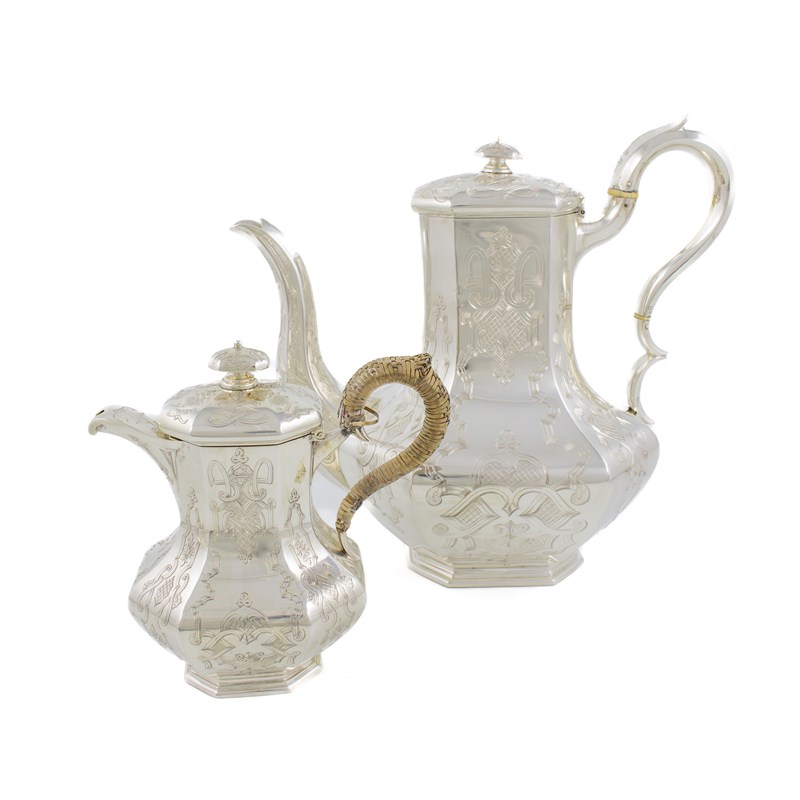 octagonal bellied form, engraved stylised scroll decoration, hinged cover with a knop finial, scroll handle with ivory insulators, wicker bound scroll handle to the hot water pot, on a stepped octagonal base, height 24.2cm, total approx. weight 41.3oz. (2)