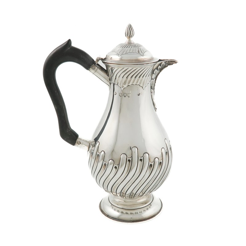 baluster form, embossed with part-fluted decoration, domed hinge cover with flame finial, scroll handle, on a raised circular foot, height 23.6cm, approx. weight 16oz.