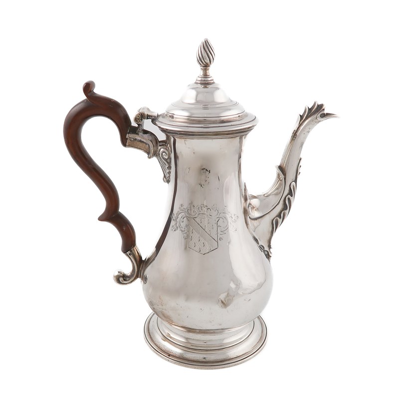 baluster form, dome hinged cover with a flame finial, engraved armorial, scroll wooden handle, foliate decorated spout, height 15.9cm, approx. weight 26.3oz.