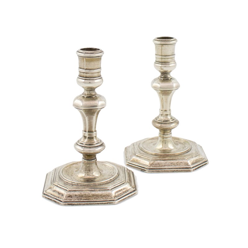 knopped baluster stem, spool-shaped capitals, on a raised octagonal base, height 9.8cm, total approx. weight 9.8oz. (2)