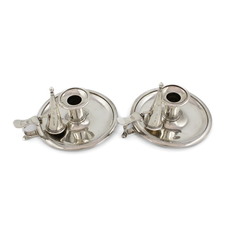 circular form, plain capital, detachable drip pans and snuffers, scroll handles, with engraved crests to the snuffers, handles and drip pans, diameter 14.6cm, total approx. weight 22.9oz (2)