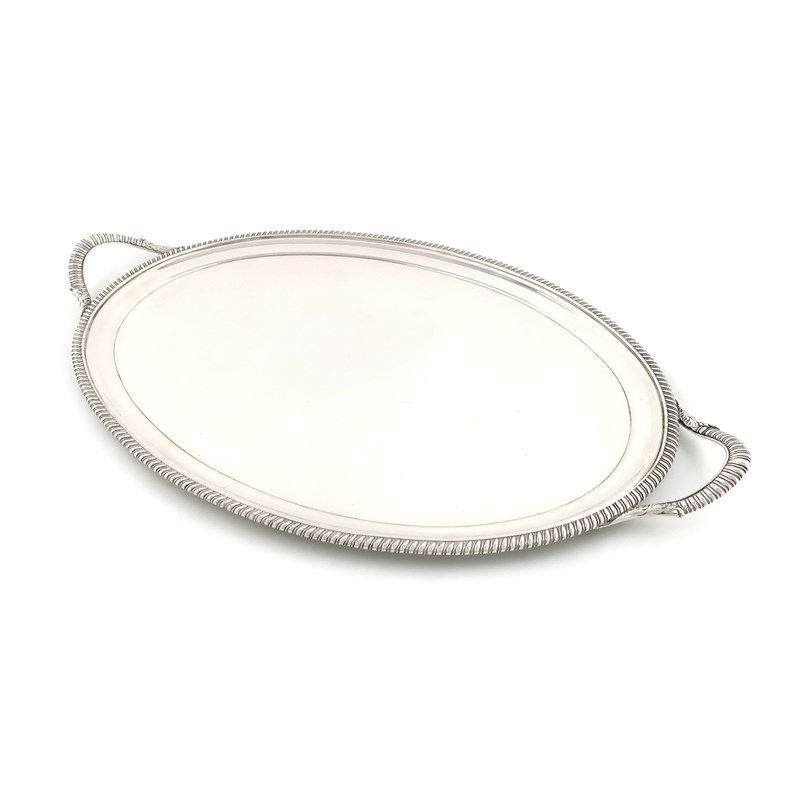oval form, gadroon border and leaf caped gadroon handles, length handle to handle 57.5cm, approx. weight 65.6oz.