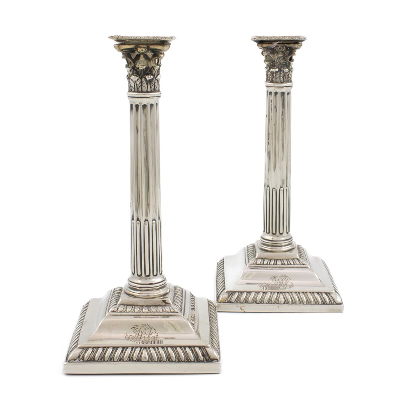 corinthian column form, gadroon borders, engraved initials, on a raised square loaded bases, height 16.8cm. (2)