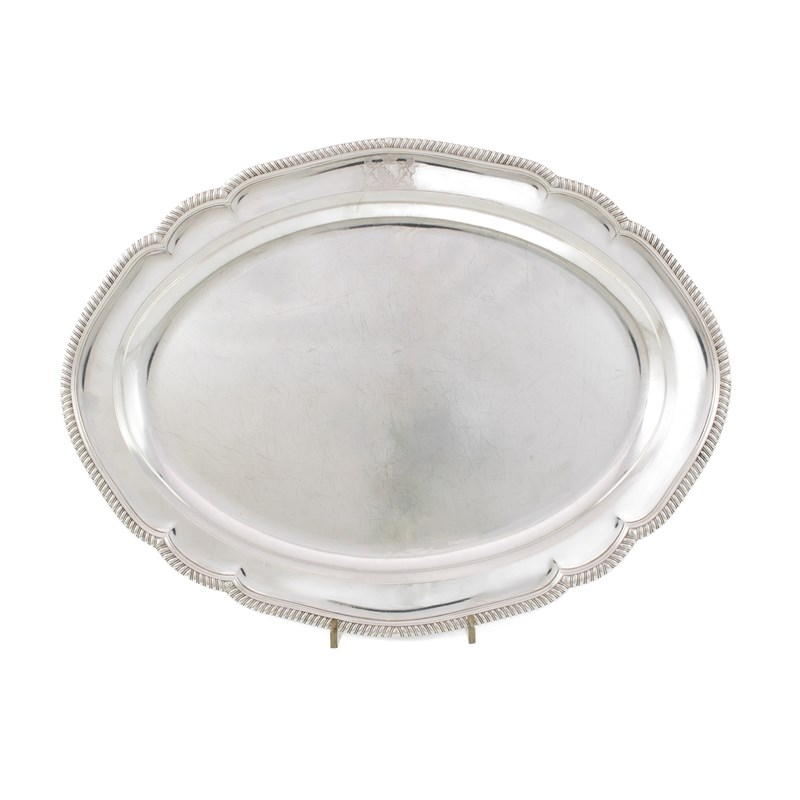 oval form, gadroon border, engraved armorial, length 46.2cm, approx. weight 60.9oz.