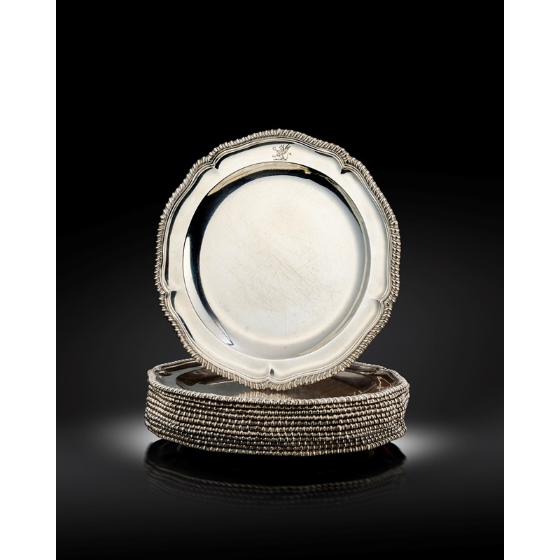 circular form, gadroon border, engraved with a crest, diameter 25cm, approx. weight 216oz. (12)