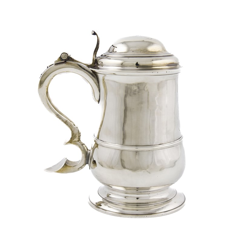 baluster form, scroll handle with a heart-shaped terminal, domed hinged cover with a pierced thumb-piece, on a circular foot, height 18.5cm, approx. weight 22.9oz.