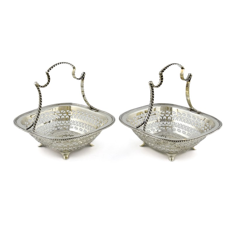 rounded square form, pierced decoration, gadroon borders and central handle, on four bracket feet, length 17.8cm, approx. weight 19oz. (2)