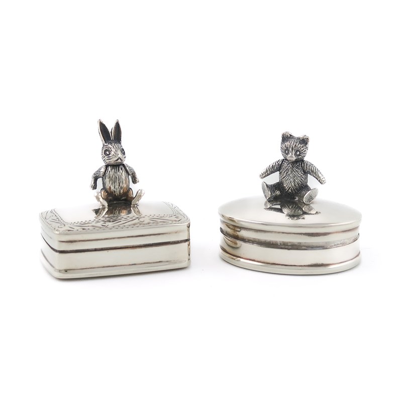 oval and rectangular form, the covers mounted with a teddy bear and a rabbit, length 3.6cm, approx. weight 1.1oz. (2)