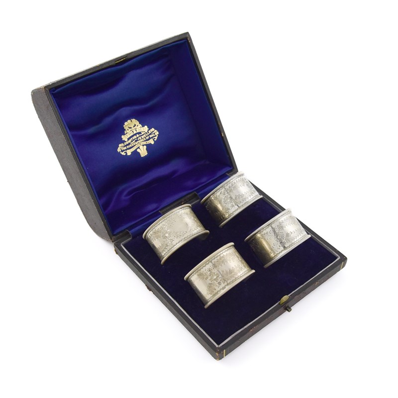 circular form, engraved decoration, rope-work border, in a fitted case, approx. weight 3.4oz. (4)