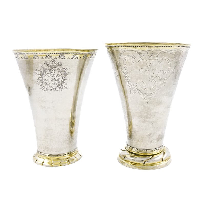 tapering circular form, gilded border, engraved foliate scroll decoration, initialled 'B.M.D' and 'A.F.S', on a lobed foot with traces of gilding, height 19.8cm, plus another 18th century Swedish silver beaker, by Henrik Nourin, Norrkoping, probably 1761, similar form, engraved with a crowned foliate cartouche, initialled 'J.D.B' over 'A.H.B', '1762', height 19cm, approx. total weight 27.6oz. (2)