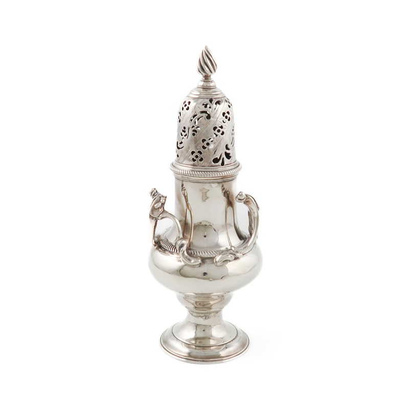 baluster form, rope-work border, with three pierced scroll motifs, the pull-off pierced cover with a fluted finial, on a circular foot, height 18.5cm, approx. weight 7.8oz.