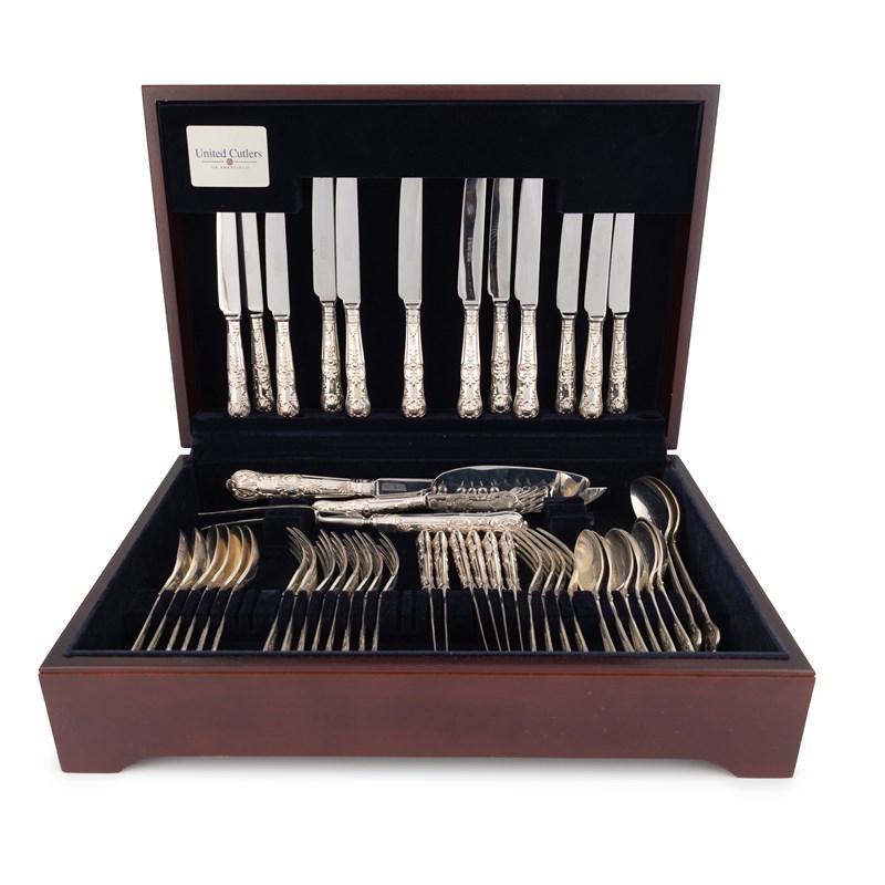 comprising: six table forks, six dessert forks, six dessert spoons, six soup spoons, two serving spoons, six table knives, six dessert knives, a cake slice and a carving set, total approx. weighable 66.7oz. (qty)
