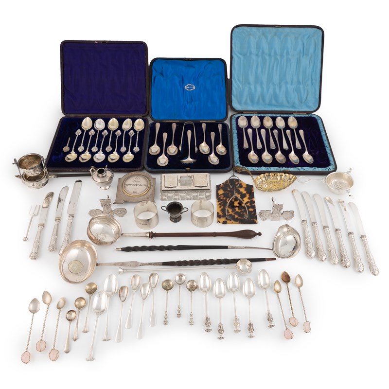 comprising silver items: three toddy ladles, nine fruit knives, seven teaspoons, ten salt spoons, a pickle fork, two napkin rings, three tea strainers, a small two-handle cup, a pot, a silver-mounted tortoiseshell desk clip, a candle snuffer, a silver-mounted glass stamp compartment and roller (a.f), a desk barometer, a cased set of teaspoons, sugar tongs and sugar sifter and two cased sets of teaspoons, plus two unmarked menu card holders and six teaspoons with wirework mounted hardstones, total approx. weighable 21.7oz. (qty)