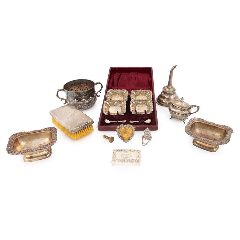 comprising: a George III silver wine funnel by Stephen Adams, London 1794, a porringer, a mustard pot, a cased set of four salt cellars and two salt spoons, a thimble, a brush, plus an unmarked pill box, a photograph frame, a pair of electroplated salt cellars and a brass seal, total approx. weighable 13.4oz. (qty)