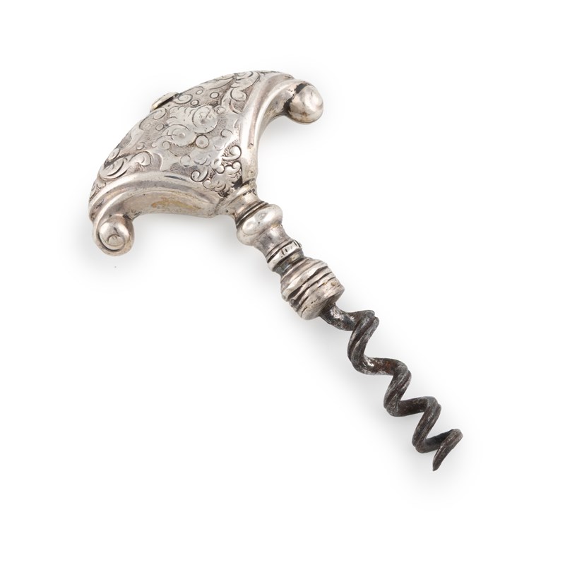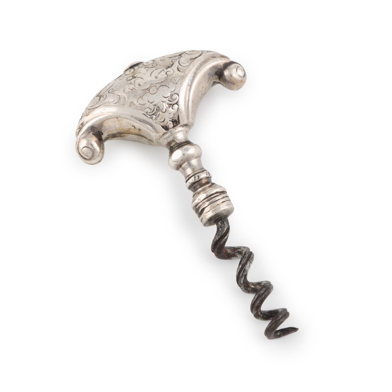 A 19th century Dutch corkscrew, no apparent maker's mark, marked with a local tax mark, scroll