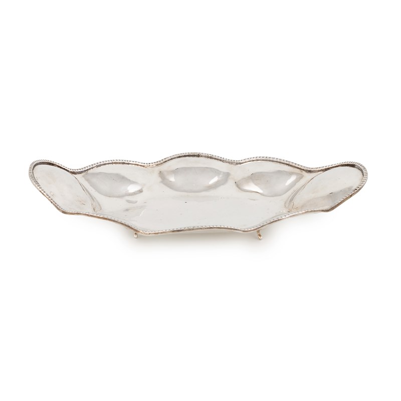 oval lobed form with a fluted border, on four pad feet, length 41.8cm, approx. weight 21.9oz.