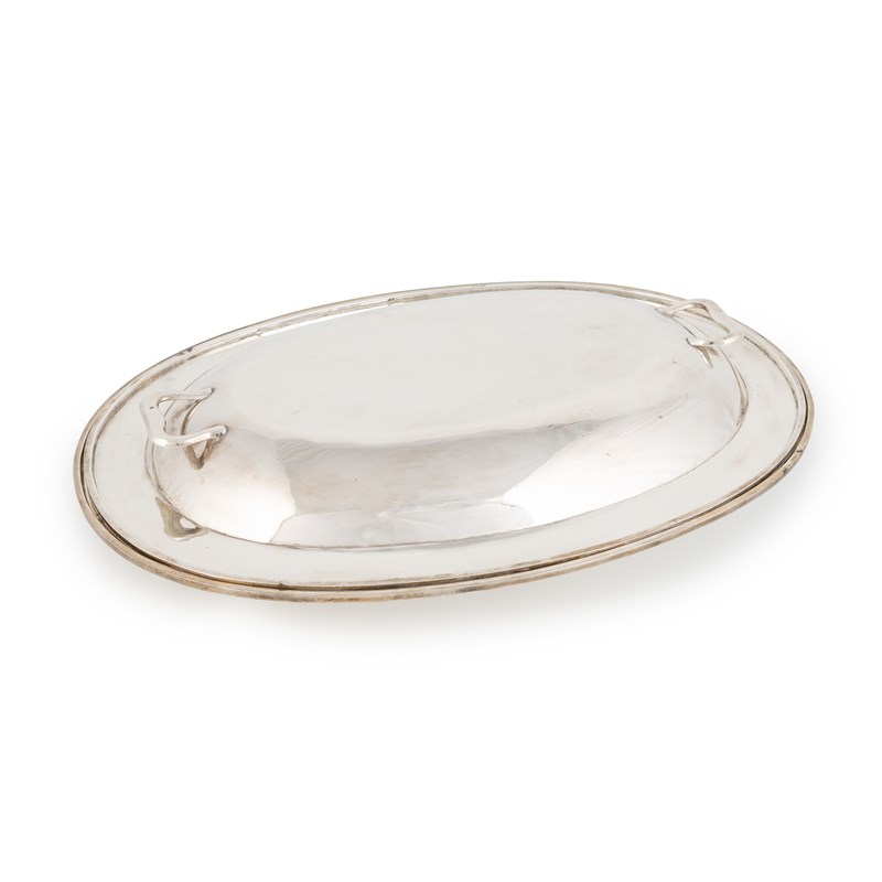 plain oval form, with a central divider, the cover with two ring handles, length 37.3cm, approx. weight 57.1oz.