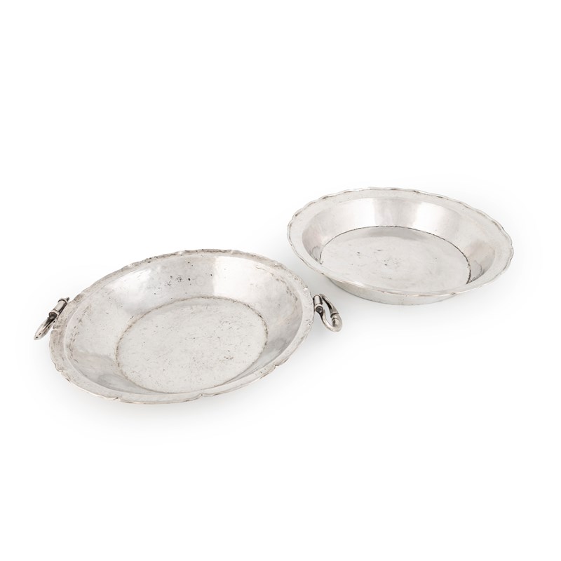 both of circular forms with slight scalloped edges, one with hinged handles, diameter 34.5cm. (2)