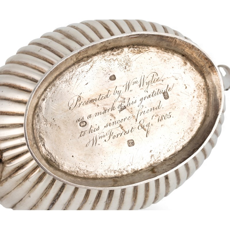 oval form with part-fluted decoration, scroll handle with ivory insulators, engraved crest and small presentation inscription to the underside 'Presented by Wm Wythe as a mark of his gratitude to his sincere friend Wm Forrest Esq 1805', length handle to spout 27.3cm, approx. weight 19.2oz.
