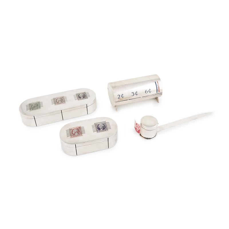 oblong form with enamel American stamps to the cover, one of similar form with worn marks, one by Abercrombie & Fitch Co, New York circa 1920, of cylindrical form, enamelled '2¢ 3¢ 6¢ Via Air Mail', and a paperknife and stamp dispenser by R.Blackinton, Providence circa 1920, total approx. weight 17.1oz. (4)