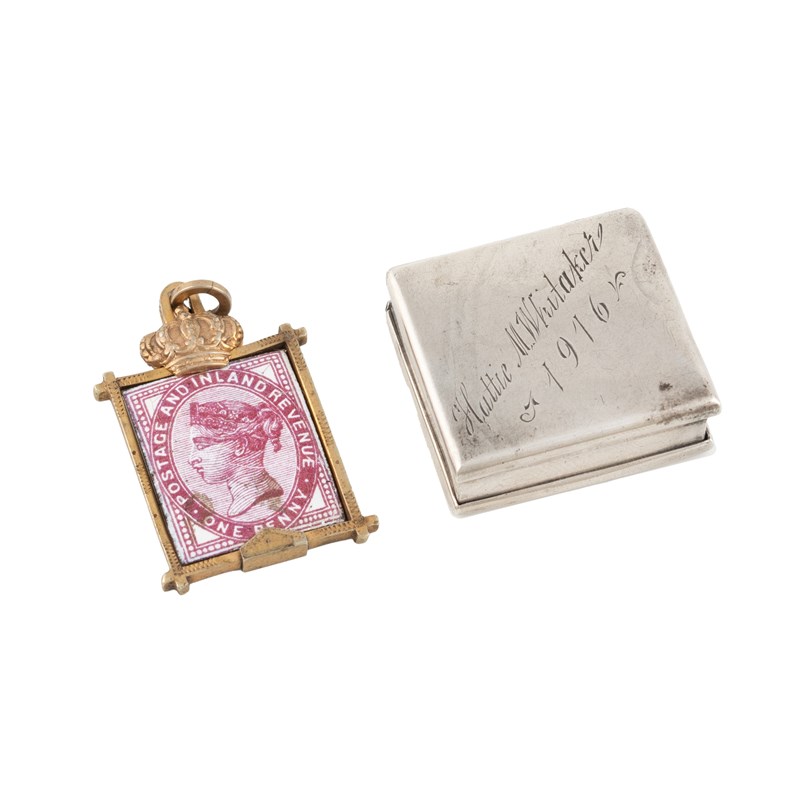 in a gilt metal frame surmounted by a crown and ring attachment, plus an unmarked stamp box, of square form with inscribed hinged sides 'Hattie M Whitaker 1916' and 'W', length 3cm. (2)