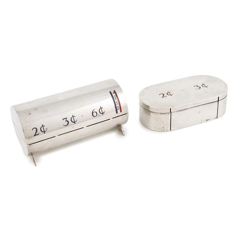 cylindrical form, enamelled '2¢ 3¢ 6¢ Via Air Mail', on two bracket feet, length 10.5cm, plus an American silver stamp dispenser, unmarked, oblong form, enamelled '2¢ 3¢', total approx. weight 8.9oz. (2)